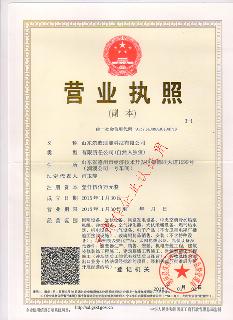 山東筑藍(lán)潔能科技有限公司創(chuàng)建于2015年,擁有建筑業(yè)企業(yè)資質(zhì)證書--城市及道路照明工程專業(yè)承包叁級(jí),是一家集設(shè)計(jì)、生產(chǎn)制造、安裝服務(wù)于一體的新能源企業(yè),專業(yè)從事太陽能路燈、LED路燈、高桿燈、庭院燈、景觀燈、中華燈、草坪燈、光伏設(shè)備、風(fēng)能發(fā)電設(shè)備的生產(chǎn)及銷售、安裝及售后服務(wù);同時(shí)還從事凈水設(shè)備、空氣凈化器、光伏采暖設(shè)備、燃?xì)鉄崴、機(jī)電設(shè)備、玻璃鋼制品的銷售、安裝,LED照明及亮化產(chǎn)品、太陽能熱水器、光伏設(shè)備及元器件生產(chǎn)、銷售、安裝;建筑裝飾裝修工程施工、兼建筑幕墻工程施工、建筑智能化工程施工等產(chǎn)品專業(yè)生產(chǎn)加工的公司,擁有完整、科學(xué)的質(zhì)量管理體系。