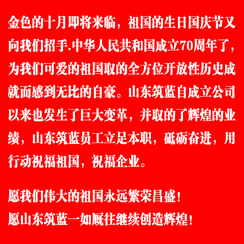 山東筑藍人踏實認真 執(zhí)著高效 ,多年來穩(wěn)步發(fā)展,奮斗不息,不斷創(chuàng)新與時俱進,歲月凝聚著我們的力量,迎著朝陽放飛夢想,山東筑藍的旗幟在前進的道路上飄揚,五星紅旗為我們指引了方向。